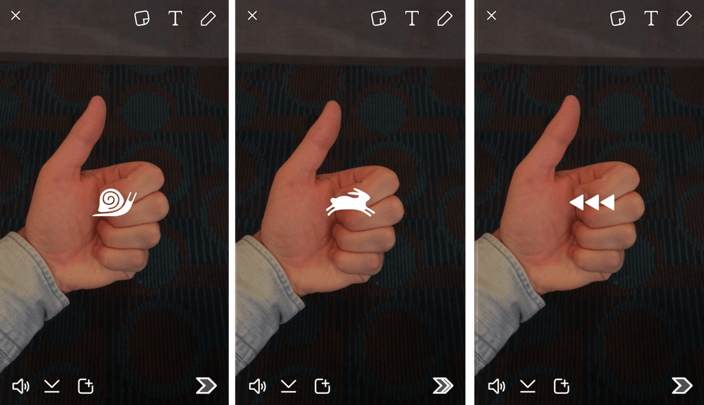 Bu filtreler video izleme sürecinde işlemiyor. Sadece video düzenleme kısmında yeni filtrelerden faydalanılabiliyor. Video çekiminin tamamlanmasının ardından sağa doğru sürükleyince üç filtre kullanıcıların karşısına çıkıyor. Yavaşlatma filtresini bir salyangoz, hızlandırma filtresini ise koşan bir tavşan temsil ediyor. Geri sarma ise klasik olarak oklarla gösteriliyor.
