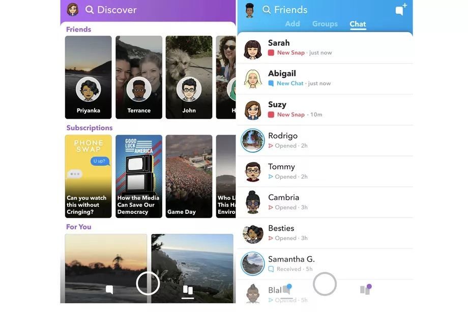 Yeni tasarım, Snap ve sohbetleri yeniden kronolojik sıraya koyuyor. Buna ek olarak, Hikayeler de arkadaşlar bölümünden alınarak yine ana ekranın sağındaki bölüme taşınıyor. Uygulama başlatıldığında, daha önce olduğu gibi, kamera aktif hâle getiriliyor. Ana ekranda sola doğru sürükleme hareketi yapıldığında yukarıda bahsi geçen bölüm açılıyor.