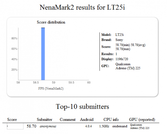 Benchmark testlerine bakıldığı zaman bu özellikleri daha somut halde görmek de mümkün oluyor. NeNaMark 2’nin sonuçlarına bakıldığında cihazın 1196×720 bir ekran çözünürlüğüne sahip olduğu görülüyor. Android 4.0 işletim sistemi üzerinden gerçekleştirilen testte, Aderno 225 GPU’nun varlığı Snapdragon S4’ün kanıtı işlevini görüyor. Söz konusu benchmark testlerinde cihazın operatörlerle uyumluluk oranı da görülüyor. LT25 Tsubasa’nın en uyumlu çalıştığı operatör olarak ise China Telecom öne çıkıyor. Sony’nin IFA 2012’de düzenleyeceği etkinlikte Xperia Tablet ile birlikte LT25 Tsubasa’yı tanıtıp tanıtmayacağı ise henüz belirsizliğini koruyor.