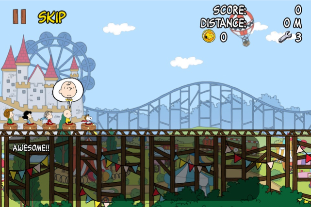 Peanuts tayfasının Snoopy önderliğinde lunapark trenine atlayarak yaşadıkları macerada ana hedef mümkün olduğunca fazla mesafe kat etmek. Ancak bu ana hedefi tutturmak için oyuncuların bunu destekleyen diğer görevleri de yerine getirmesi gerekiyor. Snoopy ve arkadaşlarının bu yolculukta kullandıkları parkur lunaparklardan aşina olduğumuz parkurları hatırlatsa da arkada kullanılan dekor sıklıkla değişiyor. Snoopy ve arkadaşları kimi zaman Amerika çöllerinde, kimi zaman kışın ortasında, kimi zaman da uzayda yer çekimsiz ortamda yola devam ediyor.