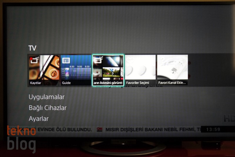 TV bölümü altında televizyona bağlanan sabit diske yapılan kayıtlar, program rehberi, kanal listesi, favori kanal ekleme gibi araçlar yer alıyor. Uygulamalar bölümü altında en başta Sony Entertainment Network bağlantısı yer alıyor. Bu bağlantı sizi TV’ye yükleyebileceğiniz bütün akıllı TV uygulamalarına götürüyor. Ayrıca bu bölüm altına, hızlı erişim amacıyla sabitlenmiş çeşitli uygulamaları da görüyoruz. APNews, Wired, Skype, YouTube, Facebook, TV Tweet bunların arasında bulunuyor. Eğer isterseniz bu listeye başka uygulamaları da ekleyebilirsiniz.