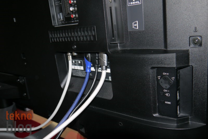 55W805A bağlantı seçenekleri bakımından da zengin bir ürün. Dört adet HDMI portunun bir tanesi MHL bağlantısını destekliyor ve kolay erişim için televizyonun sol kenarında bulunuyor. Arkada yer alan diğer dört adet HDMI portu da sola doğru yerleştirilmiş ve televizyonun duvara monte edilmesi durumunda bu portlara daha rahat erişim sağlanması amacıyla çıkışları aşağı doğru bakar hâle getirilmiş. Ayrıca televizyonda üç adet USB portu bulunuypr, bunlardan bir tanesi sabit diske kayıt yapma amaçlı olarak ayrılmış. Common Interface (CI) yuvası, uydu anteni girişi, karasal yayın anetini girişi, kulaklık jakı, Ethernet portu, optik dijital çıkış, SCART soketi, analog stereo girişleri, birleştirilmiş kompozit/komponent video girişi de arkada göze çarpıyor.