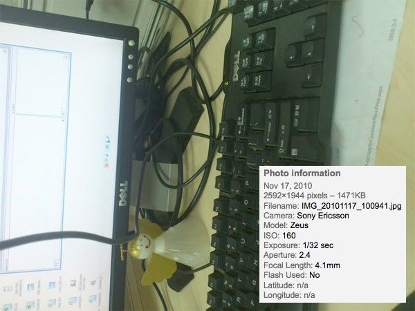 Sony Ericsson’un PlayStation cep telefonu, nam-ı diğer Zeus Z1 ile ilgili bilgi sızıntıları sürüyor. Görünüşe göre telefon bazı kişiler tarafından test edilmeye başlanmış bile. Bir telefonu test ederken yapılan şeylerden bir tanesi de doğal olarak telefonun kamerasını kullanarak fotoğraf çekmek ve mümkünse bu fotoğrafı paylaşım uygulaması üzerinden Picasa veya Flickr gibi çevrimiçi fotoğraf paylaşım sitelerine göndermektir. Bizim bahsettiğimiz olayı birileri gerçekleştirmiş ve fotoğrafın EXIF verileri sayesinde bunu yakalamak da mümkün olmuş.