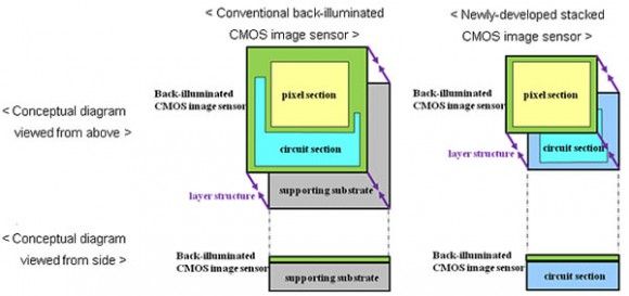 Sony, dijital makineler için geliştirdiği yeni nesil arkadan aydınlatmalı CMOS sensörünü duyurdu. Yeni CMOS sensörün geliştirilmesi sırasında piksel bölümü arkadan aydınlatma yapılı piksellerle katmanlanıp işaret işleme görevi üstlenen yongaya yerleştiriliyor. Katmanlanmış yongada tipik arkadan aydınlatmalı CMOS sensörlerin barındırdığı normal alt katman desteği yer almıyor.