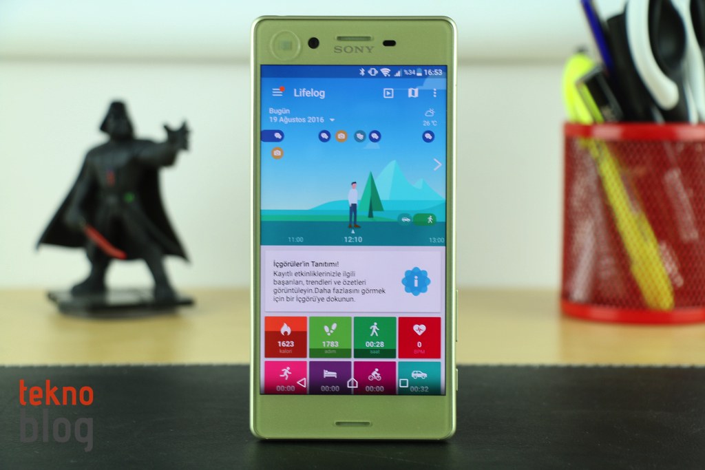 Her ne kadar kullanıcı arayüzündeki sadelik göze çarpsa da, Sony kendi uygulamalarını yükleme konusunda yine cömert davranmaya devam ediyor. What’s New, Sketch, Movie Creator gibi çoğu zaman hiç kullanmadığınız uygulamaların Xperia X’te yüklü olduğunu göreceksiniz. Bununla birlikte Lifelog gibi bir fitness ve sağlıklı yaşam uygulamasının bulunduğunu görüyoruz. Neyse ki, o uygulama biraz daha kullanışlı; gün içinde attığınız adım sayısını, yaktığınız kalori miktarını gösteriyor. Üstelik ne kadar süre boyunca oyun oynadığınız, kitap okuduğunuz, internette gezindiğiniz gibi bilgileri de Lifelog uygulamasına ekleyebilirsiniz.