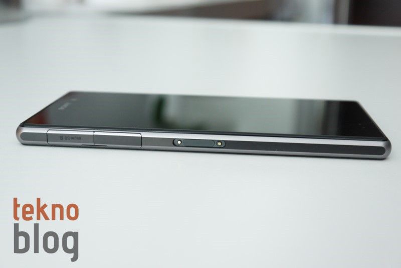 Xperia Z1’in üst kenarında sadece 3.5 mm. kulaklık jakını görüyoruz. Sol kenarda microSD ve microUSB portları var ve bunların ikisi de kapaklarla koruma altına alınıyor. Bunların biraz altında yerleştirme istasyonları ve diğer aksesuarların kullanımını sağlayan iki pinli konnektör portu bulunuyor, bu port da herhangi bir kapakla örtülmüyor. Sony’nin Xperia telefonlarının alamet-i farikası hâline gelen küçük ve yuvarlak güç butonu sağ kenarda yer alıyor. Bunun hemen altına ses tuşları yerleştirilmiş. Güç butonunun üstünde bir kapak arkasına gizlenmiş microSIM kart yuvası bulunuyor. Hemen gözünüze çarpmayacaktır, ancak microSIM kart yuvasını hemen yanında turuncu renkli bir düğme var. Sivri uçlu bir cisim yardımıyla basılabilen bu düğme Xperia Z1’in zorla kapatılmasını sağlıyor. Cihazın kilitlendiği veya yavaş çalıştığı durumlarda işe yarayabilir. Ses tuşunun altında ise kamera için yerleştirilmiş özel bir tuşun bulunduğunu görüyoruz.