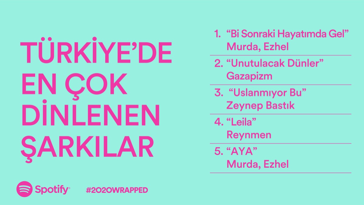 Geçen seneye oranla pek çok yeni sanatçının daha fazla şarkıyı müzikseverlerle buluşturduğu 2020 yılında Türkiye’nin en çok dinlenen şarkısı iki rapçi Ezhel ve Murda’nın “Bi Sonraki Hayatımda Gel” şarkısı olurken; ikinci sırada Gazapizm‘in “Unutulacak Dünler” adlı kaydı yer aldı. Üçüncü sıraya Zeynep Bastık’tan “Uslanmıyor Bu” yerleşirken; TOP 5 şarkı listesinin devamına yine rap şarkıları damga vurdu. Reynmen‘den “Leila” dördüncü, Ezhel ve Murda’nın bir diğer düetleri “AYA” ise beşinci sırada yer aldı. Türkiye’de 2020 yılında en çok dinlenen 10 şarkının 9’u Türkçe şarkılardan oluşurken; tek yabancı şarkı, Tones And I‘dan “Dance Monkey” oldu. Türkiye?nin TOP 10 şarkı listesinde rap’e diğer müzik türleri eşlik etti. Yüzyüzeyken Konuşuruz’dan “Kazılı Kuyum” ve İkiye On Kala‘dan “Kafamda Kentsel Dönüşümler“, Türkiye’de 2020 yılının en çok dinlenen 10 şarkısı arasında yer alan indie şarkılar olurken, Didomido ve Eglo G düeti olan elektro pop türündeki “Nimet” de 2020 yılına damga vuran bir diğer şarkı oldu.