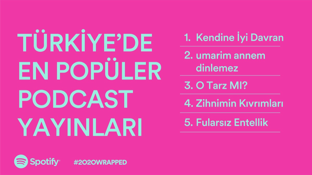 2020 yılının dünya genelindeki en popüler podcast yayını The Joe Rogan Experience olurken, ikinci sıraya TED Talks Daily, üçüncü sıraya ise The Daily yerleşti. Dördüncü sırada The Michelle Obama Podcast, beşinci sırada ise komedi türündeki Call Her Daddy yer aldı.Türkiye’de 2020 yılında en çok dinlenen podcast yayınları ise şöyle sıralandı: En çok dinlenen 5 podcast yayınının birinci sırasına Kendine İyi Davran, ikinci sırasına umarim annem dinlemez, üçüncü sırasına ise O Tarz Mı? yerleşti. Listenin dördüncü sırasında Zihnimin Kıvrımları bulunurken beşinci sırada Fularsız Entellik yer aldı.