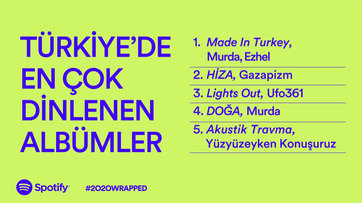 Türkiye’de 2020 yılında en çok dinlenen albümlere gelince; listenin ilk sırasında Murda’nın Made In Turkey albümü yer aldı. Murda’yı sırasıyla Gazapizm’in HİZA ve Ufo361?in Lights Out albümleri takip etti. Dördüncü sıraya Murda’nın bir diğer albümü olan DOĞA yerleşirken, Türkiye’nin TOP 5 albümü listesinin son sırasında ise Yüzyüzeyken Konuşuruz grubunun Akustik Travma adlı albümü yer aldı.