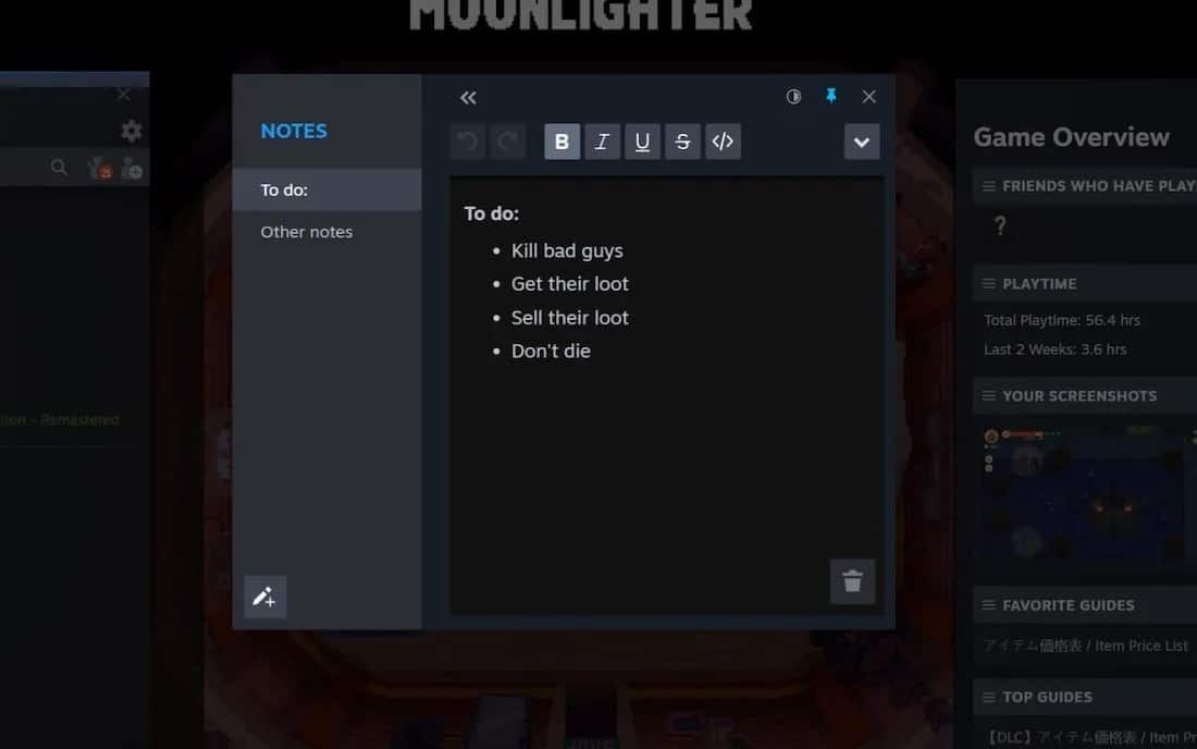 Bir işe başlamadan önce “yapılacaklar listesi” oluşturmak, o işi daha hızlı ve kolay şekilde bitirmeye yardımcı olabiliyor. Steam, bunun video oyunları için de işe yarar bir şey olacağını düşünüyor. Platform için hazırlanan en son güncelleme, entegre Notlar uygulamasını da beraberinde getiriyor. Bu uygulama oyun ekranının üstünde açılabiliyor ve oyuncuların “yapılacaklar listesi” oluşturmasını mümkün kılıyor. Oyuncular bu listeye farklı cihazlardan Steam hesaplarına giriş yaparak ulaşabiliyor.