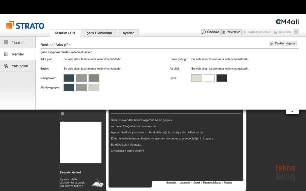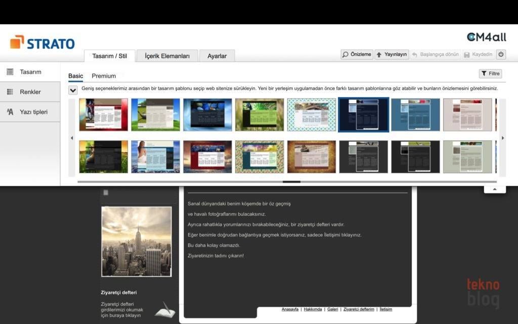 Ekranın büyük bölümünü kaplayan alt kısımda sayfanın ön izlemesi yer alıyor. Üst kısımda ise tasarım, içerik ve ayarlara erişebileceğiniz kontrol bölümü bulunuyor. Tasarım / Stil sekmesi altından yeni bir tasarım seçebilirsiniz. Basic ve Premium başlıkları altında zengin tasarım şablonları kullanıcıları bekliyor. Renkler ve Yazı tipleri bölümünden siteniz için uygun renk ve yazı tipi düzenlerini belirleyebilirsiniz. Hem renkler hem de yazı tipleri için zengin bir kontrol aralığı bulunuyor. Başlıklar, navigasyon metinleri, tüm renk düzenleri kontrol edilebiliyor.