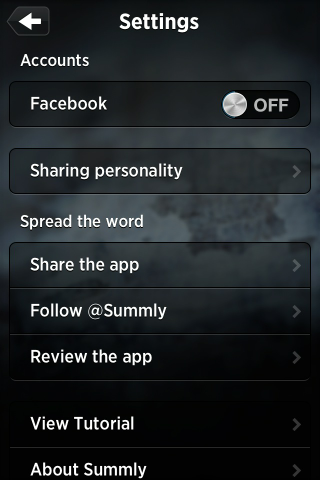 Kategorileri yönetme ekranının üst köşesinde bulunan dişli ikonuna dokunulduğu zaman ise uygulamaya ait farklı ayarlara da erişim şansına ulaşılıyor. Bu menüde Summly’nin nasıl kullanıldığına dair bir rehber, uygulamaya ilişkin daha geniş bilgiler ve Facebook bağlantısını aktif hale getirme seçeneği yer alıyor.