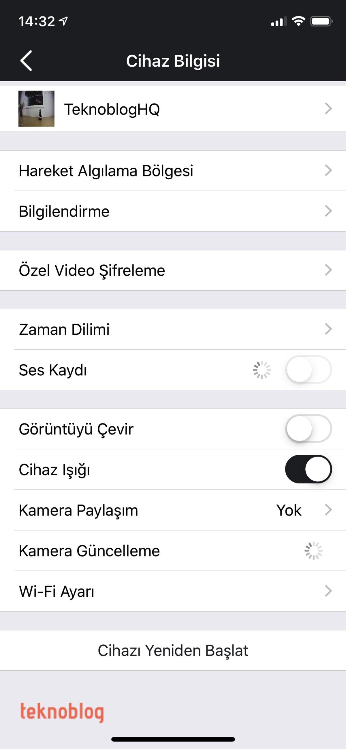 Kamera sayfasının sağ üst köşesinde yer alan dişli ikonu üzerinden kamera ayarlarına erilebilirsiniz. Buradan kamera resmi, adı, kanal adı ve bunun gibi bilgileri özelleştirebilir, kamera şifresini değiştirebilirsiniz. Video şifreleme, zaman dilimi, ses kaydı, görüntü çevirme, cihaz ışığı, kamera güncellemesi, Wi-Fi ayarı, kamera paylaşımı gibi ayarlar da burada bulunuyor. Cihazı yeniden başlatmak için bir kestirme de buraya eklenmiş.