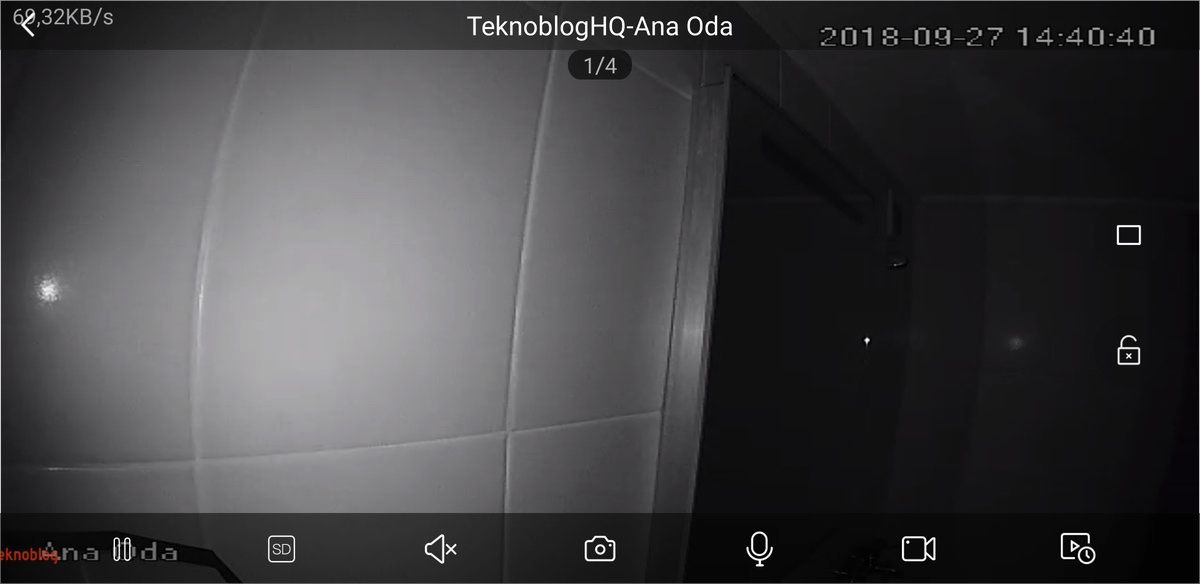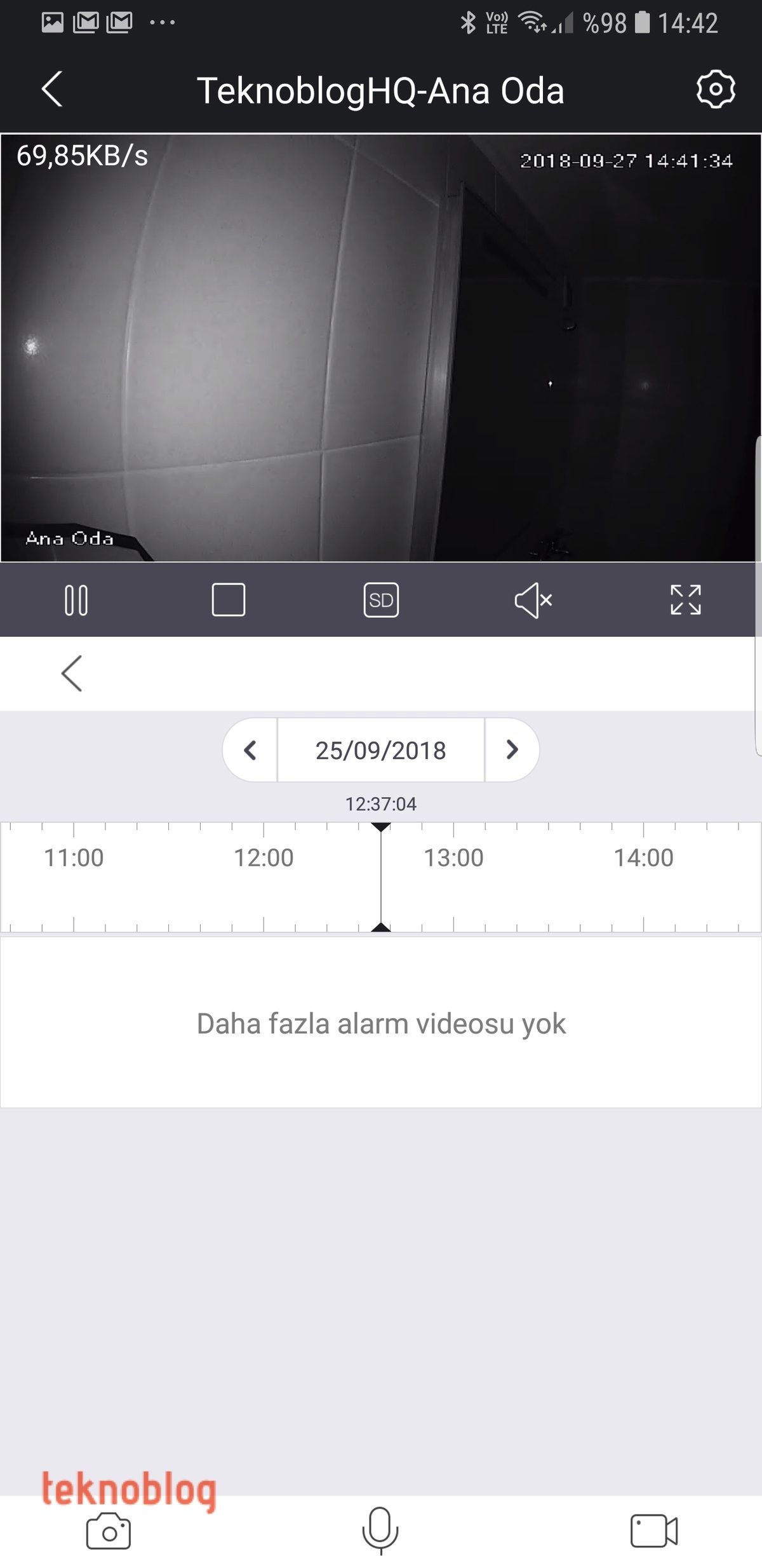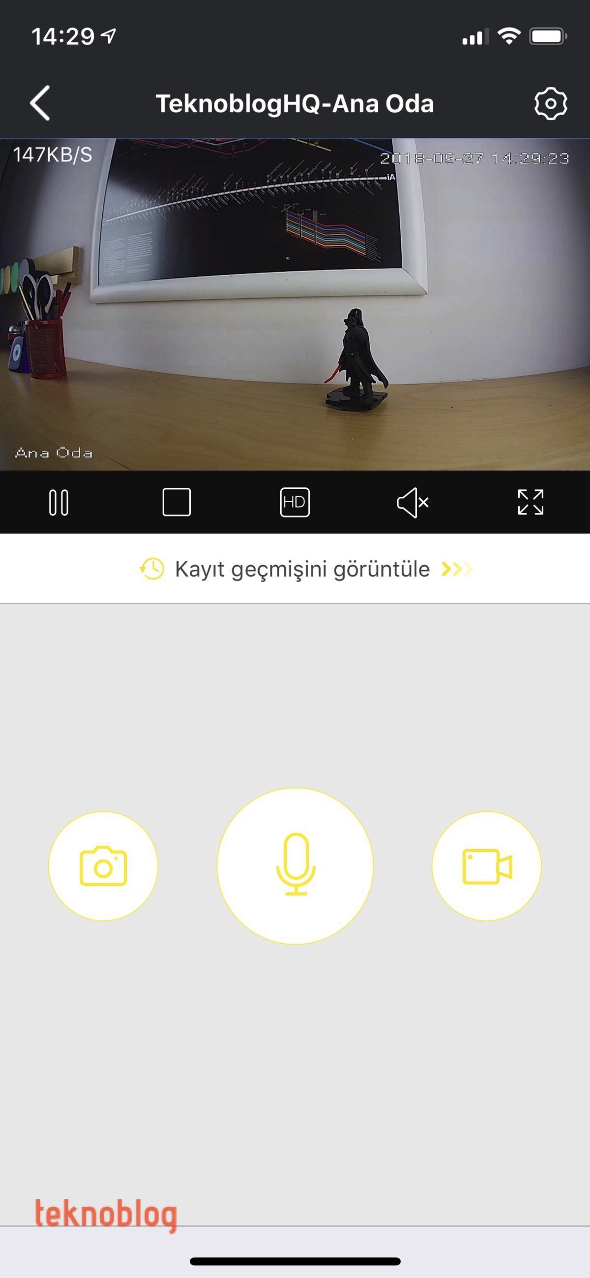 Kamera penceresinin altında ise akışı duraklatma, durdurma, sesini kapatma, tam ekrana getirme ve SD ile HD kalite arasında geçiş kontrolleri mevcut. Kayıt Geçmişi kontrolü şeklindeki açılır menü ise bir zaman çizgisi üstünde kameranın yaptığı kayıtları gösteriyor ve bunları izlemenizi sağlıyor. Öte yandan kameraya ait izleme sayfasında ekran görüntüsü alma, mikrofonu kullanma ve video görüntüsü kaydetme gibi özellikleri görüyoruz. İstediğiniz bir anın ekran görüntüsünü alabileceğiniz gibi, belirli bir zaman aralığının video kaydını elle başlatabilirsiniz. Ayrıca mikrofon ikonuna tıklatarak da kameranın bulunduğu ortamdaki kişi veya kişilere seslenebilir, onların da sesini duyabilirsiniz. Bu şekilde kamera üzerinden iki yönlü iletişim kurulabiliyor.