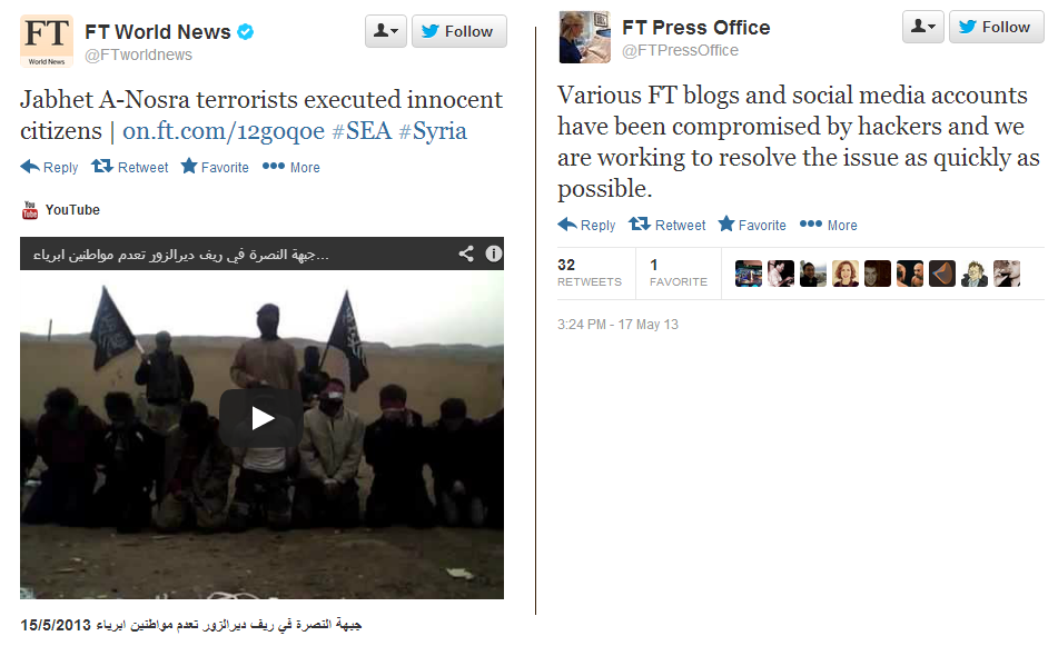 Beşar Esad yanlısı Suriye Elektronik Ordusu tarafından düzenlenen siber saldırıların son hedefi Financial Times oldu. Reuters’in haberine göre gazetenin hem internet sitesi hem de ana Twitter hesabı saldırıya uğradı. İnternet sitesinde başlıklar Suriye Elektronik Ordusu’nun siteye saldırdığına dair bir deklarasyonla değiştirilirken, Twitter hesabı da Beşar Esad yönetimini devirmeyi hedefleyen muhaliflere saldırmaya yönelik tweet’lerin atılması için kullanıldı. Bir süre sonra söz konusu tweet’ler silinirken, sitenin manşetleri de düzeltildi.