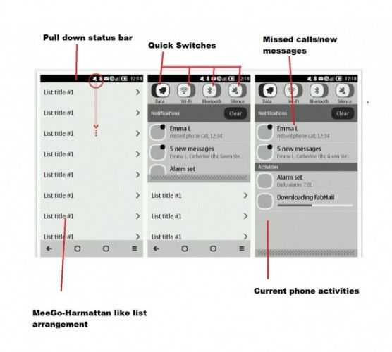 Yukarıdaki görüntü @Harkinson rumuzlu bir Twitter kullanıcısı tarafından paylaşılmış. Kendisinin Qt’nin hızlı kılavuzlarında rastladığı bu görüntüyle ilgili olarak MyNokiaBlog bazı ayrıntılara dikkat çekiyor. Buna göre, söz konusu arayüz Nokia N9’un MeeGo-Harmattan arayüzüyle bazı benzerlikler taşıyor. Liste formatı ve “swipe” benzeri arayüzün MeeGo’ya çok benzeyeceği belirtiliyor. Ekran görüntüsü aşağı doğru çekilen durum çubuğu ve içerik tabanlı alt çubuğu da açığa çıkarıyor.