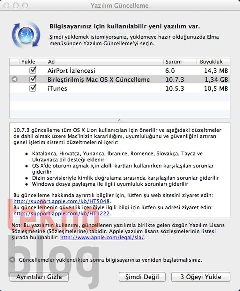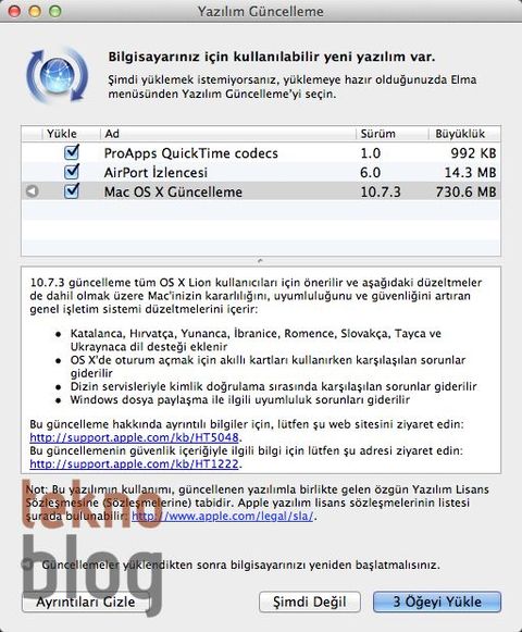 Apple'ın masaüstü işletim sistemi OS X Lion için 10.7.3 sürüm numaralı yeni bir güncelleme yayınlandı. Yaklaşık 700 MB'lık bir dosya büyüklüğüne sahip olan bu güncellemeyle birlikte Katalanca, Hırvatça, Yunanca, Tayca