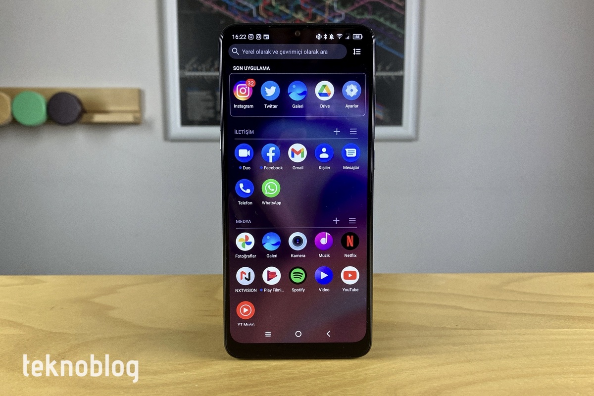TCL UI arayüzlü diğer cihazlarda gördüğümüz uygulama çekmecesi TCL 10 SE’de de mevcut. Çekmecede uygulamalar, çeşitli kategoriler altında gruplandırılmış biçimde kullanıcıları karşılıyor. Örneğin, iletişim başlığı altında Facebook, Gmail, Google Duo, Kişiler gibi uygulamalar bulunuyor. Spotify, Netflix, YouTube gibi uygulamalar ise medya kategorisine gönderiliyor. Chrome, Drive, Keep Notları gibi uygulamalar içinse kamu hizmetleri gibi ilginç bir kategori başlığı seçilmiş.