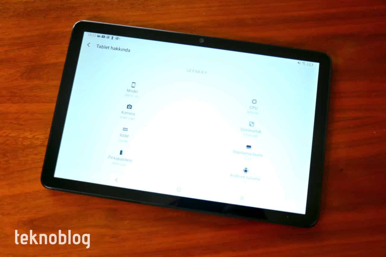 Önde yer alan 5 megapiksel kameranın yerleşimi, tabletin esas olarak yatay tutuşa göre tasarlandığını gösteriyor. Aslında bu iyi bir durum, çünkü görüntülü görüşmelerde veya online derslerde görüntünüzün karşı tarafa en iyi açıdan gösterilmesi sağlanacaktır. Düşey yönde tutuşta, ön kamera sağda kalacak biçimdeki tutuşu normal tutuş kabul edersek, üst kenarda güç tuşu, USB-C portu ve hoparlör ızgaraları var. Ayrıca pil durumunu gösteren küçük bir LED lamba da burada mevcut. Alt kenarda da iki hoparlör ızgarası var. Toplamda dört hoparlör ızgarası varsa, bunlardan sadece iki tanesi ses çıkışı veriyor. Yatay biri sağda, biri solda olmak üzere iki kısa kenarda birer hoparlör bulunuyor.