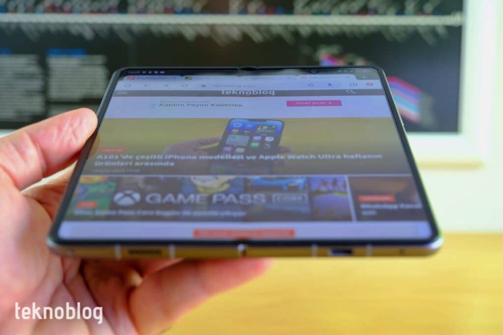 PHANTOM V Fold’un menteşesi çizgili deseniyle telefona hoş bir hava katarken, yapısı itibarıyla içteki katlanabilir ekranın üzerindeki oluğun derinliği çok sığ kalıyor. Şimdiye kadar deneyimlediğimiz aynı biçimdeki katlanabilir telefonlara göre en sığ oluğu gördüğümüzü söyleyebiliriz. Bununla birlikte oluk genişliği diğerlerinden az da olsa fazla. Bu durumun en büyük avantajı kat izinin gözle görülürlüğünün epey azalması oluyor. Zaten telefona karşıdan baktığınızda herhangi bir kırışıklık fark etmiyorsunuz. Beyaz renkli arka planlarda, ekrana yanlardan bakıldığında veya ışık yansıdığında, kat izinin belirginliği de düşük kalıyor.