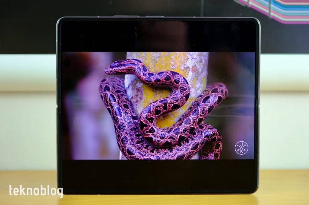 Arkada üste doğru ortalanmış büyük bir kamera modülü var. Bu kamera modülü dışa doğru hatırı sayılır bir çıkıntı yapıyor. Burada üç kamera ve LED flaş mevcut. Alt kenarda USB-C portu, mikrofon, nano SIM kart yuvası ve mikrofon yer alıyor. Üst kenarda ise ikinci hoparlör ve ikinci mikrofon var. Ses tuşları ve parmak izi okuyucusunun entegre edildiği güç düğmesi ise, hem telefon hem de tablet biçiminde kullanırken sağda kalıyor. Bu tuşlar el yordamıyla rahatlıkla erişilecek biçimde yerleştirilmiş. Parmak izi okuyucusu hızlı biçimde çalışıyor, tepki hızı iyi. Telefonu deneyimlediğim süre boyunca genellikle bu birimi kullandım. Öte yandan katlanabilir ve kapak ekrandaki selfie kameralar aracılığıyla yüz tanıma ile de ekran kilidini geçebilirsiniz. O da hızlı biçimde çalışıyor.