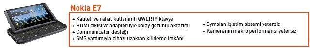 Nokia E7, 1300-1350 TL bandında bir satış fiyatına sahip. Bu seviyede güçlü Android cihazları var. Ayrıca biraz daha para veren tüketiciler iPhone 4 sahibi de olabilir. Her ne kadar Nokia E7 bu güçlü rakipler karşısında pek de parlamasa da, göz ardı edemeyeceğimiz bazı artı noktaları var. Sağlam, rahat kullanım sunan QWERTY klavyesi, ergonomik tasarımı, HDMI çıkışı barındırması ve HDMI adaptörüyle birlikte gelmesi, USB On-The-Go desteği, Communicator uygulaması ve zengin video kod desteğiyle Nokia E7 onun için vereceğiniz paranın hakkını verebilir.