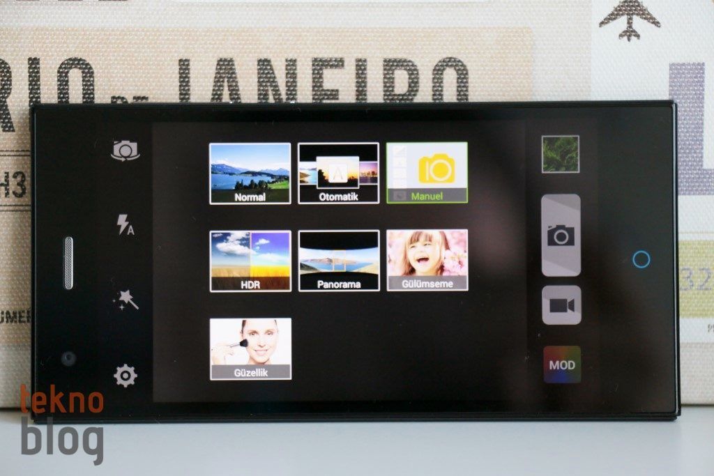 Kamera uygulamasını açtığınızda sağ tarafta fotoğraf ve video çekim tuşlarını, aynı zamanda çektiğiniz en son fotoğraflara açılan küçük resmi göreceksiniz. Ayrıca ekranın diğer köşesinde MOD şeklinde bir kutucuk göreceksiniz. Buna dokunduğunuzda açılan modlar arasında Normal, Otomatik, HDR, Panorama, Gülümseme ve Güzellik gibi çeşitleri göreceksiniz. Genellikle Normal ve Otomatik modlar işinizi görecektir, ancak eğer daha fazla kontrol isterseniz, Manuel modu kullanabilir; ISO, beyaz dengesi, pozlama telafisi, netlik, doygunluk gibi ayarları istediğiniz gibi kontrol edebilirsiniz.