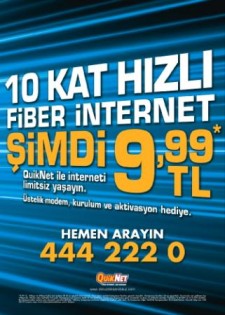 22.01.2009 İSTANBUL – Tellcom, dünyada bir noktadan başka bir noktaya data iletiminde bilinen en yüksek hız olan ışık hızında internet hizmetinde yeni bir kampanya başlattı. Fiber internet kampanyası kapsamında fiyatlar 9,99 TL?den başlarken, kurulum, modem ve aktivasyon da kullanıcılara ücretsiz olarak sunuluyor. Ayrıca 1Mbps ve 5Mbps aboneleri, ADSL ile sunulamayan 10 Mbps hızını deneyimlemeleri amacı ile ilk iki ay 10Mbps hızında internet erişimine sahip olabiliyorlar.