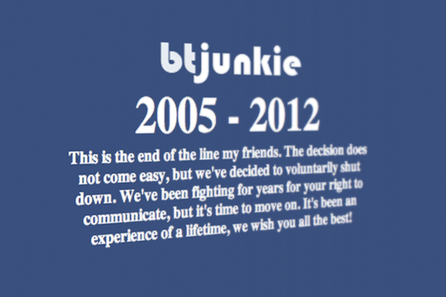 BitTorrent arama motoru BTJunkie bugün itibariyle servislerini kendi rızasıyla durdurdu. Sitenin ana sayfasına gidenler 2005-2012 tarihleri ve kullanıcılara yazılmış bir veda mesajı içeriyor.