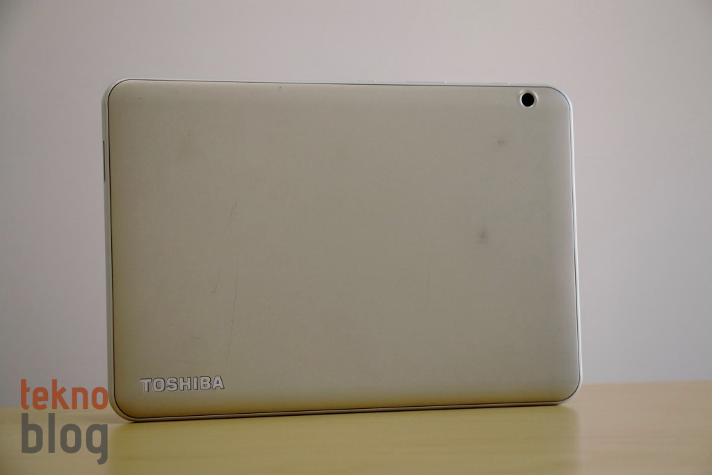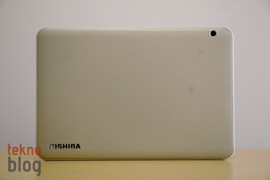 Encore 2 WT10.1’in mat ve yumuşak yüzeyli plastik arka yüzü ise genel olarak temiz bırakılmış. Arkadan bakıldığında sağ üst köşeye denk gelen 5 megapiksel kamera bulunuyor. Bunun çaprazına gelecek şekilde, sol alt köşede de büyükçe bir Toshiba logosu dikkat çekiyor.