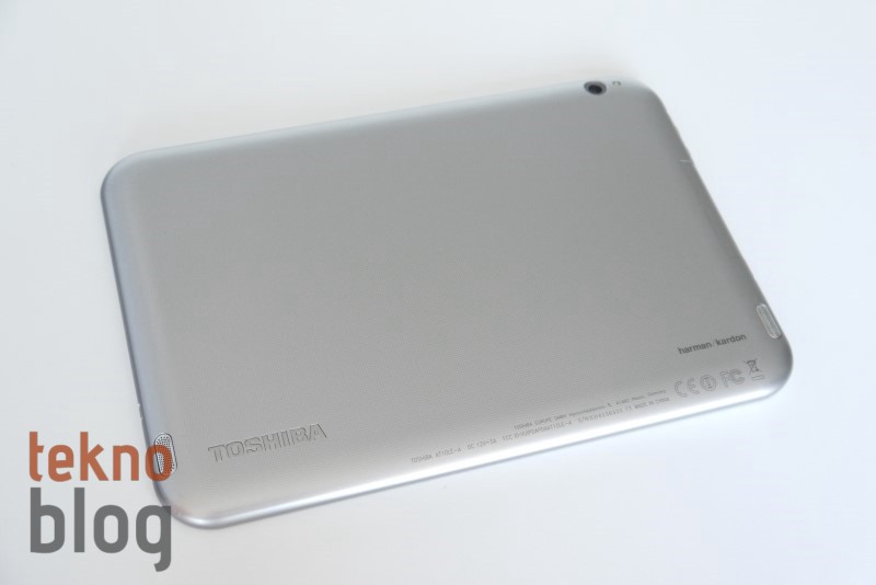 Önde yer alan 10.1 inç ekranın uzun kenarları boyunca yerleştirilmiş bileşenler bu tablet için genelde yatay oryantasyonda kullanımın öngörüldüğünü gösteriyor. Ekranın üstünde 1.2 megapiksel kamera, çevresel ışık sensörü yer alırken, altta da Toshiba ve Harman Kardon logolarının yer aldığını görüyoruz. Logolar sayesinde ön yüzün sıkıcılığı biraz olsun gideriliyor. Kavisli köşeler de tablete biraz daha sıcak hava katıyor, kullanıcının tablete biraz daha hızlı şekilde ısınmasını sağlıyor.