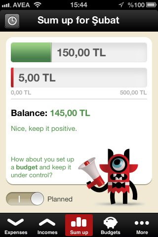 Daha önce belirlediği aylık gelirin kapsamında ya da bundan bağımsız bir özel bütçe oluşturmak isteyen kullanıcılarsa yine alt çubukta yer alan Bütçe ikonuna dokunarak bu isteklerini gerçekleştirebiliyorlar. Bu bütçe kapsamında yapılan harcamalar için kullanıcıların ayrıyeten bir giriş yapması gerekmiyor. Bütçeye özel etiketlerin belirlenmesinin ardından kullanıcılar bu etiketler altında yaptıkları harcamaları bir kez uygulamaya girdikleri zaman özel bütçeden de bu giderin düşülmesi mümkün oluyor.