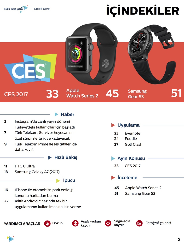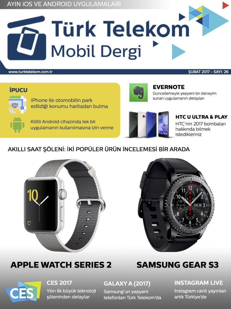 Türk Telekom’un dijital dergisi Türk Telekom Mobil Dergi’nin Şubat 2017 sayısı yayınlandı. Yeni sayı tam bir akıllı saat şöleni; bir değil, iki popüler akıllı saatin detaylı incelemesi bu sayıda yer alıyor.