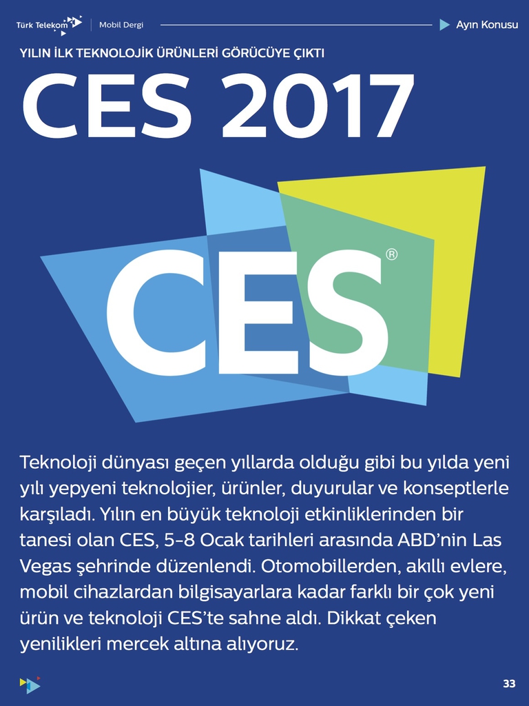 Yılın ilk büyük teknoloji etkinliği olan CES 2017 de Mobil Dergi’nin Şubat 2017 sayısında detaylı şekilde işleniyor. Akıllı telefonlar, giyilebilir ürünler, dizüstü bilgisayarlar ve diğer yeni ürünlerle ilgili bilmek istedikleriniz Ayın Konusu bölümünde yer alıyor.