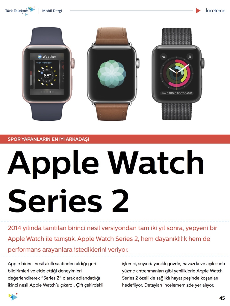 Apple’ın geçtiğimiz aylarda Türkiye piyasasına getirdiği ikinci nesil akıllı saati Apple Watch Series 2 hakkında merak ettiklerinizi Mobil Dergi’nin Şubat 2017 sayısında bulabilirsiniz. 50 metre derinliğe kadar suya dayanıklı olan bu akıllı saatin tasarım, fitness, yazılım ve diğer detayları incelemede yer alıyor.