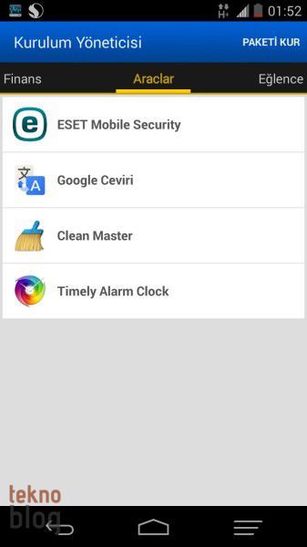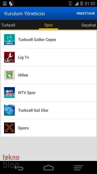 Daha önceki Turkcell Android telefonlarında gördüğümüz Kurulum Yöneticisi Turkcell T50’de de bulunuyor. Turkcell büyün uygulama ve servislerini T50’ye yükleyip onu şişirmek yerine, uygulamaları yükleme noktasında tercihi tüketicilere bırakıyor. Spor, Seyahat, Finans, Araçlar, Eğlence ve Turkcell gibi farklı başlıklar altında hem Turkcell’in hem de anlaşmalı üçüncü taraf sağlayıcıların uygulamaları paket hâlinde yer alıyor.