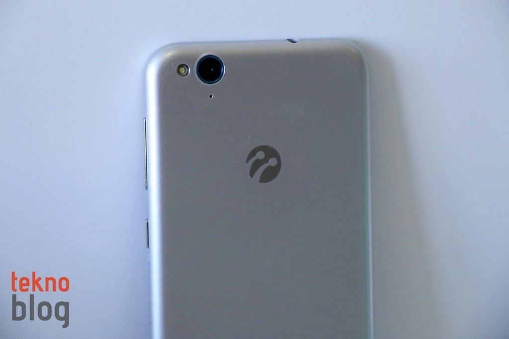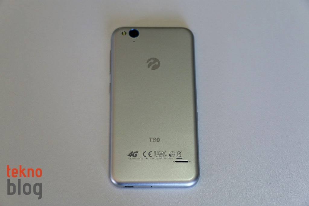 ZTE üretimi olan Turkcell T60’ın kenarlarını ve arkasını metal görünümlü plastik yüzey kaplıyor. Bu yüzey kendisini metal gibi hissettirme konusunda başarılı sayılır, ancak ekran camı gibi çiziklere karşı hassas olduğunu söylemekte fayda var. Turkcell T60’ın bu plastik kapağı yerinden çıkarılamıyor, ana gövdeyle sabitlenmiş. Arkada 13 megapiksel kamera, LED flaş ve ikinci mikrofon birbirine yakın şekilde konumlandırılmış. Turkcell logosu, T60 markası, 4G logosu ve diğer ticari ve endüstriyel işaretler de alt kenara doğru yer alıyor. Bunların hemen altında, arkadan bakıldığında sağa doğru kaymış şekilde hoparlörü görüyoruz. Bu hoparlörün her iki ucuna yerleştirilmiş olan küçük topuzlar, Turkcell T60 bir yüzeye konulduğunda sesin çıkışı için küçük de olsa bir yol oluşturuyor.