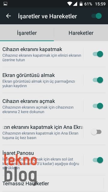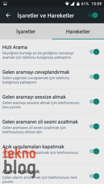 Turkcell T60’ın ilginç yanlarından bir tanesi de çeşitli hareketler ve kontrollerle kontrol edilebilmesi. Ayarlar uygulamasında Sistem bölümü altında yer alan İşaretler ve Hareketler bölümünde Cihazın ekranını kapatmak, Ekran görüntüsü almak, Cihazın ekranını açmak, Hızlı arama, Gelen aramayı cevaplandırmak, Gelen aramanın zil sesini azaltmak gibi çeşitli işlevleri işaret veya hareketlerle gerçekleştirmeyi sağlayan ayarları göreceksiniz. Bunların hepsini açabileceğiniz gibi sadece istediklerinizi etkinleştirebilirsiniz. Her bir işaret veya hareketin nasıl kullanılacağı İşaretler ve Hareketler sayfası altında açıklamasıyla yer alıyor.