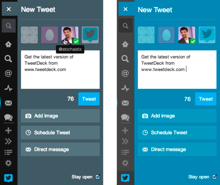 TweetDeck’in web ve Chrome uygulamalarına yapılan son güncellemeyle ”Yeni Tweet” paneli elden geçirildi. Bu güncelleme sayesinde yeni tweet yazma, direkt mesaj gönderme ve görüntü ön izleme özellikleri yeni bir çehreye kavuşmuş oldu. Ekranın sol tarafındaki çubuğa yerleştirilen ”Yeni Tweet” paneli görüntü ön izlemelerini özellikle öne çıkarırken; aynı zamanda kullanıcı adı ve etiket önerilerinde bulunuyor ve web adreslerini otomatik olarak 22 karaktere indiriyor. Yenilenmiş panel birden fazla hesapta tweet atma işlemini de daha hızlı ve kolay bir hale getiriyor.