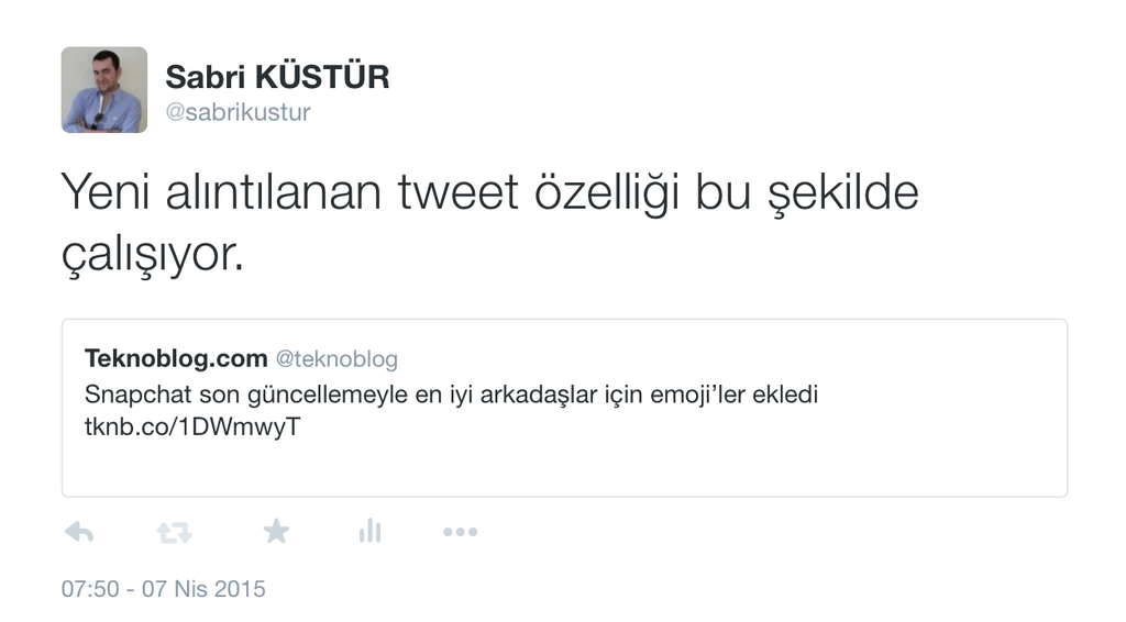 Yeni alıntılanan tweet özelliği bu şekilde çalışıyor. https://t.co/ZAJSSOlxCa