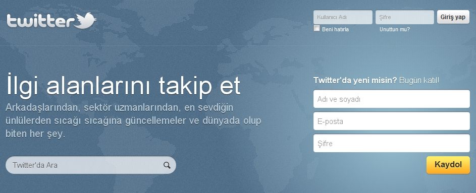 Twitter’ın ana sayfasına girdiğinizde, sayfanın altında yer alan dil seçenekleri arasında Türkçe’yi de görüyor olmalısınız. Bu bağlantıya tıkladığınızda karşınıza Twitter’ın Türkçe olarak hazırlanmış ana sayfası “İlgi Alanlarını Takip Et” başlığıyla karşınıza çıkacak.