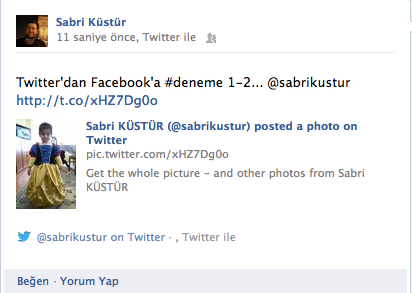Twitter ile Facebook’un arasındaki derinleştirilmiş entegrasyonu görmek için birkaç test yaptık. Eğer bir tweet’te fotoğraf, bir kullanıcıdan bahsetme ve etiket bir arada varsa, öncelik fotoğrafa veriliyor. Ayrıca Facebook’ta paylaşılan mesajda fotoğrafın küçük resim versiyonu ve bu tweet’in Twitter üzerindeki sayfasına bağlantı da bulunuyor. Fotoğrafın paylaşılmadığı sadece kullanıcı bahsi veya etiketin olduğu durumlarda ise ilgili etiketle ilgili daha fazla sonucun yer aldığı Twitter sayfasına bağlantı veya tweet’te bahsi geçen Twitter hesabına ait bağlantı ve profil fotoğrafının küçük harfi Facebook’ta paylaşılan Twitter tweet’ini süslüyor.