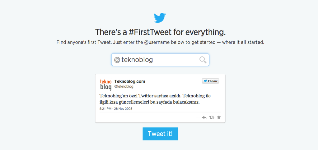 Yarın 8. yaş gününü kutlayacak olan mikro blog servisi Twitter, bunun için kullanıcıların hem kendilerine hem de diğer kullanıcılara ait ilk tweet’leri bulmasını kolaylaştırdı. Twitter kullanıcıları uygulamanın Keşfet bölümüne eklenen #FirstTweet sekmesi üzerinden bu işlemi gerçekleştirebiliyor.