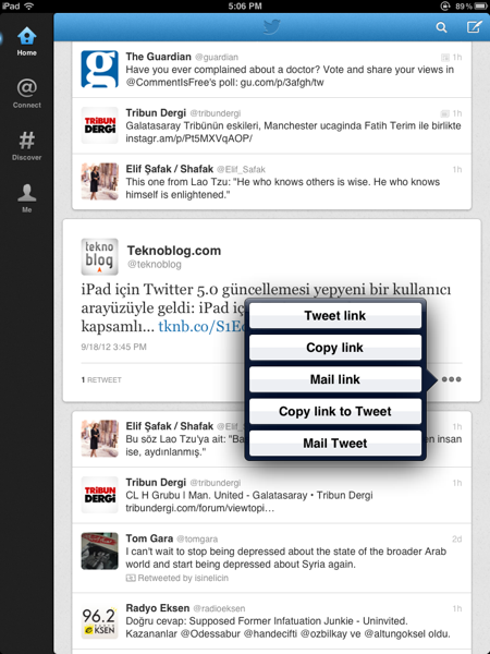 Twitter’ın iPhone ve Android uygulamalarını kullananlar için genel hatlara bakıldığı zaman bu uygulama fazlası ile tanıdık gelecektir. Twitter, bir süre önce gerçekleştirdiği güncelleme ile iPhone ve Android uygulamalarında kullandığı arayüzü iPad uygulamasında da kullanmaya başladı. Fakat, iPad uygulaması ile bu uygulamaların birebir aynı olmadığını hemen belirtmekte fayda var. iPad uygulamasına ilk kez bakıldığı zaman, tıpkı daha önceki sürümde olduğu gibi, sekmelerin yine ekranın soluna yerleştirilmiş olması dikkat çekiyor. Daha dikkat çekici olan nokta ise, eski arayüze nazaran ekranın sol tarafında yer alan sekmelerin azaltılmış olması. Uygulama yatay durumda kullanıldığı zaman ise her iki tarafta da oluşan boşlukları farketmemek neredeyse imkansız.