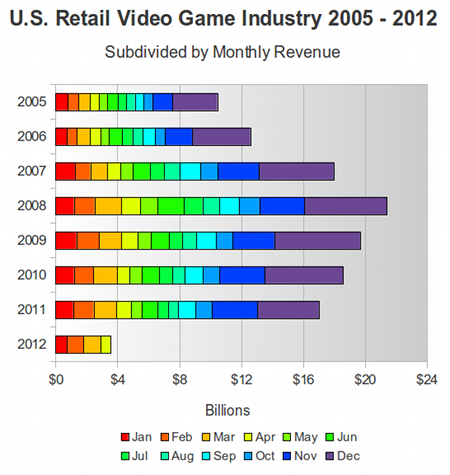 NPD Group’tan analistlerin yaptığı son çalışmalara göre, konsol ve el cihazı satışları %42 oranında gerilemiş durumda. Şubat ayındaki tahminlerde bu oranın%26’da kalması bekleniyordu. Söz konusu cihazlar için satılan oyunlardan elde edilen gelir ise 503 milyon dolardan 292 milyon dolara gerilemiş durumda. Bu verilerin Nisan 2011 ve Nisan 2012 arasında toplandığını belirtmekte fayda var.