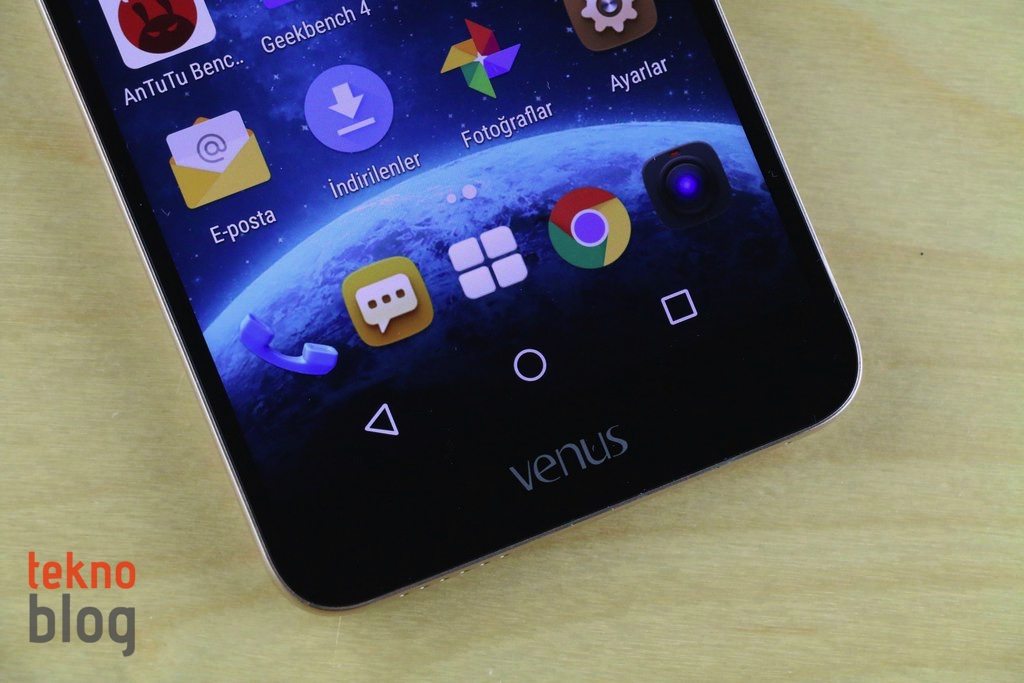 Venus V3 5580’in ön tarafında herhangi bir tuş bulunmuyor. 5.5 inç ekranı saran çerçeve özellikle yan taraflarda oldukça ince. Ekranın alt kısmında Venus logosu yer alırken, üst kısmında da ahize hoparlörü ve 5 megapiksel çözünürlüklü ön kamera bulunuyor. Akıllı telefonun menüsünde dolaşım sanal navigasyon tuşlarıyla sağlanıyor.