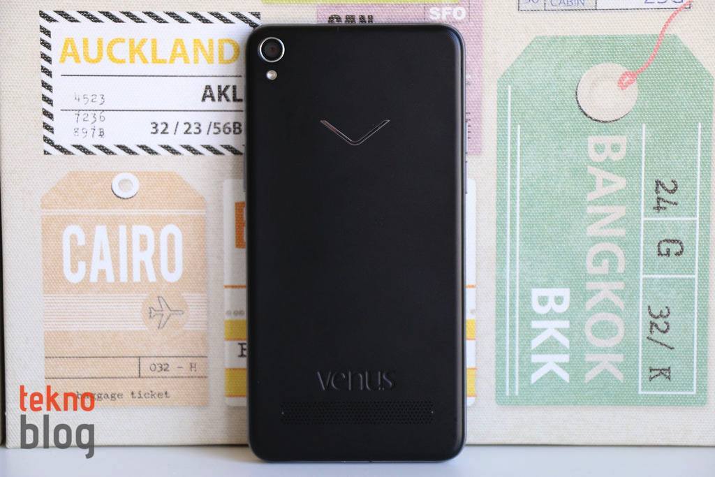 Venus V3 5020’nin arka panelinde sol üst kısımda 8 megapiksel çözünürlüklü arka kamera yer alıyor. Kameranın hemen altına ise flaş yerleştirilmiş. Panelin orta üst kısmında Venus serisinin logosu olarak kabul edilebilecek “V” harfi bulunuyor. Daha aşağıya doğru inildiğinde ise panele işlenmiş Venus yazısı ve hemen altına yerleştirilen hoparlör ızgarası bulunuyor. Hoparlörün arka panele yerleştirilmiş olması, telefon bir yüzey üstüne koyulduğunda ses çıkışını biraz olsun etkiliyor. Arka kapak ve alt kenarın buluştuğu noktadaki küçük boşluk ise arka kapağın yerinden çıkarılmasını sağlıyor. Bu kapak açıldığında kullanıcıların karşısına 3140 mAh kapasiteli pil ile microSIM ve microSD yuvaları çıkıyor. Bu noktada Venus V3 5020’nin pilinin yerinden çıkarılamadığını belirtmek gerekiyor.