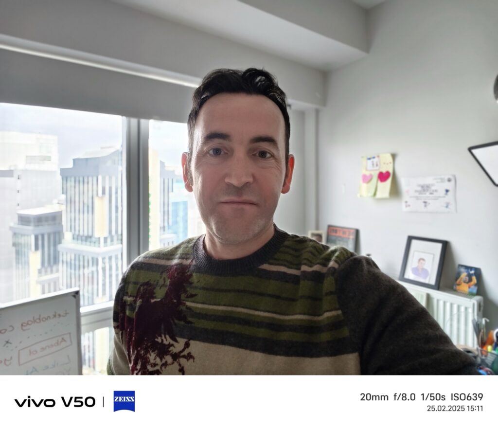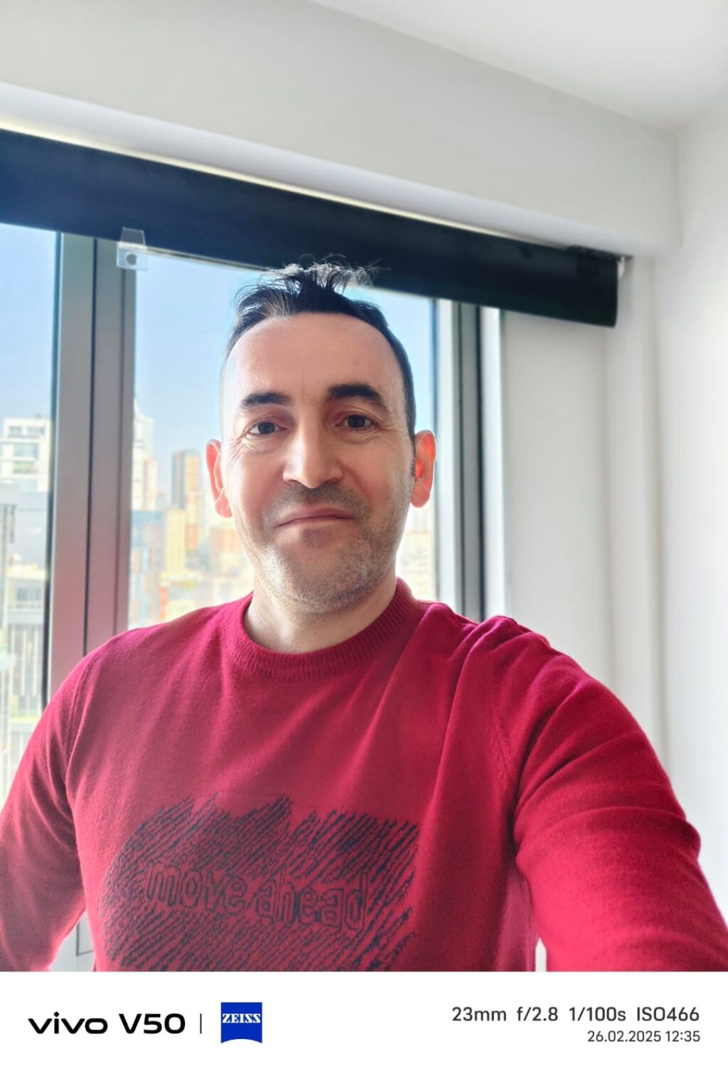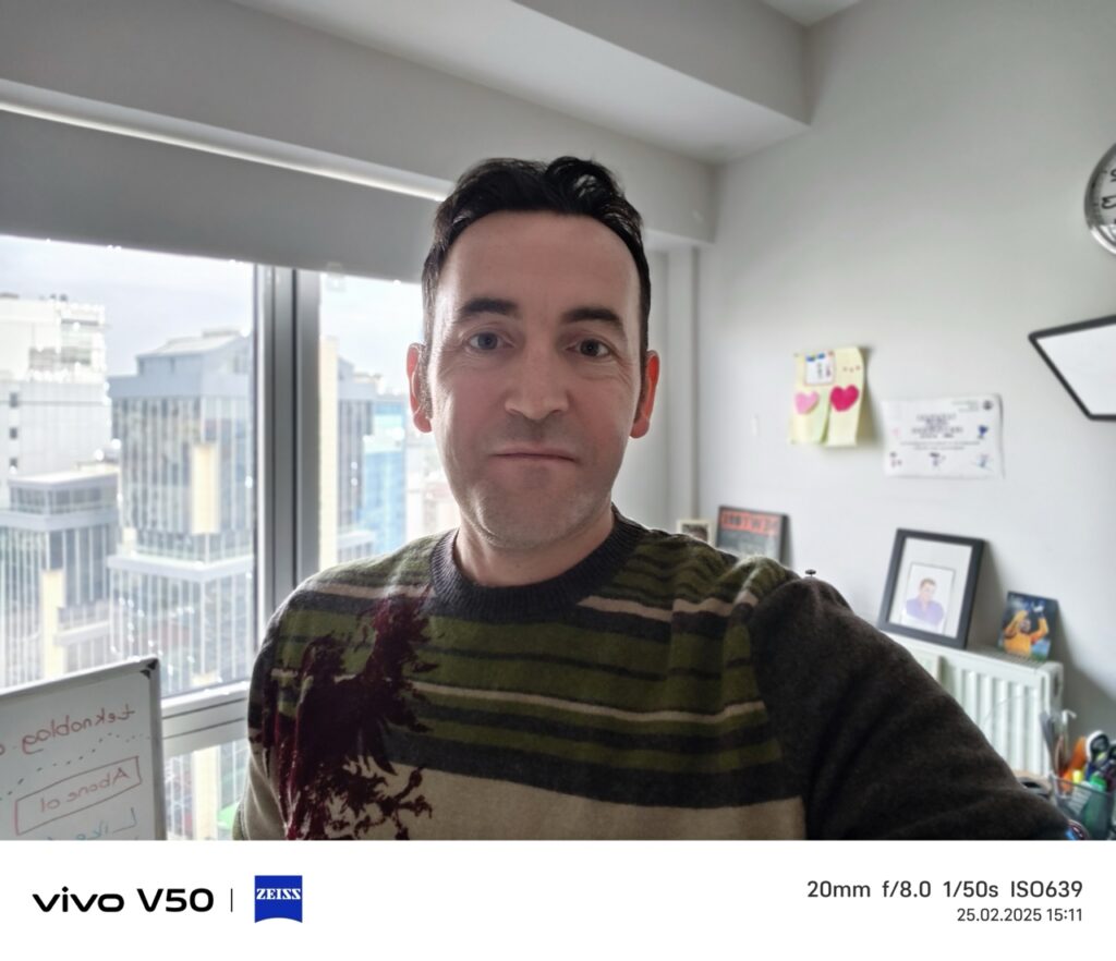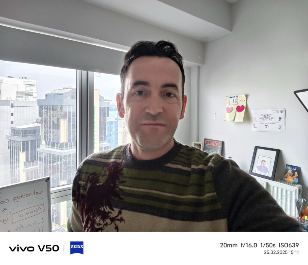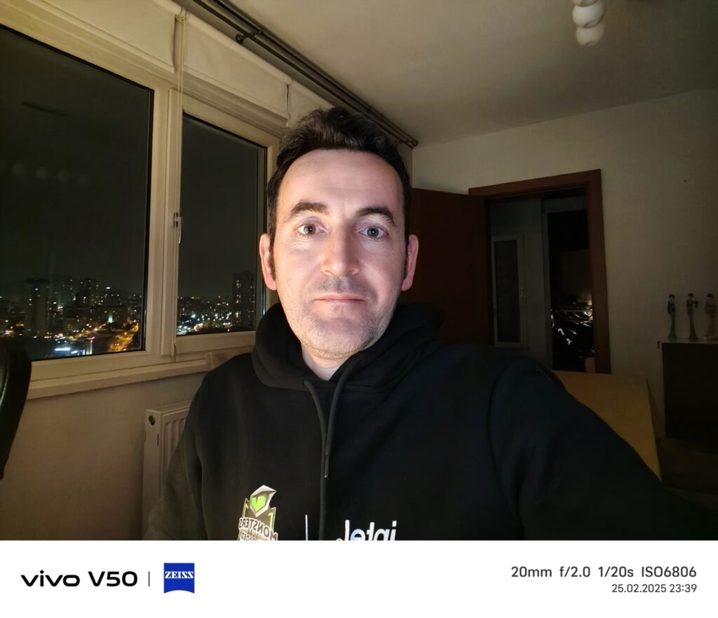 Ön kamera tarafında Vivo V50, 50 MP’lik yüksek çözünürlüğüyle rakiplerinden ayrılmayı başarıyor. Geniş açılı lens sayesinde grup selfie’leri çekmek oldukça kolay hale geliyor. Detay seviyesi oldukça iyi olsa da, bazı durumlarda cilt tonları biraz fazla yumuşatılabiliyor. Ancak, HDR desteği sayesinde arka plan parlaklık dengesi çok iyi sağlanıyor, özellikle güneşli ortamlarda çekim yaparken yüzünüzü gölgede bırakmadan doğru pozlamayla kaydediyor. Gece çekimlerinde ise, yapay zekâ destekli gürültü azaltma sistemi sayesinde detay kayıpları minimum seviyede tutuluyor. Genel olarak, Vivo V50’nin selfie kamerası hem gündüz hem de gece çekimlerinde oldukça başarılı bir performans sergiliyor.