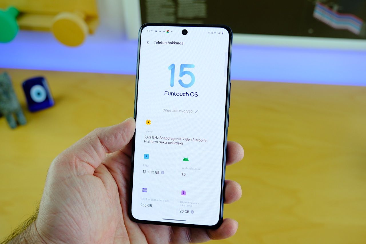 Vivo V50’nin performans tarafında Snapdragon 7 Gen 3 işlemcisi yer alıyor. Bu açıdan V40 modeline göre değişen bir şey yok. Qualcomm’un orta segment için sunduğu bu çipset, günlük kullanımda akıcı bir deneyim sunmayı başarıyor. 8 GB, 12 GB ve 16 GB RAM seçenekleriyle gelen telefon, Türkiye’de 12 GB RAM ve 256 GB dahili depolama alanı ile satılıyor. 12 GB fiziksel RAM’in yanında 12 GB sanal RAM kullanma imkanı da var. RAM miktarının yüksek oluşunun da büyük katkısıyla V50, çoklu görevlerde herhangi bir takılma veya gecikme yaşatmıyor. Uygulamalar arası geçişler hızlı, sosyal medya kullanımı akıcı ve günlük görevler sorunsuz bir şekilde yerine getirilebiliyor.