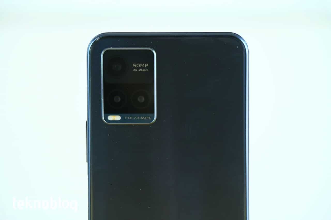 Yine arka tarafa döndüğümüzde, sol üst köşeye yerleştirilmiş dikdörtgen şekilli kamera modülünü görüyoruz. Bu kamera modülü üç kamerayı ve LED flaşı barındırıyor. Vivo logosu da kamera ile aynı doğrultuda, aşağı doğru konumlandırılmış. Vivo logosu yatayda yerleştirilse de, kameranın üstündeki 50 megapiksel işareti ve diğer yazılar düşey yönde konumlandırılmış.